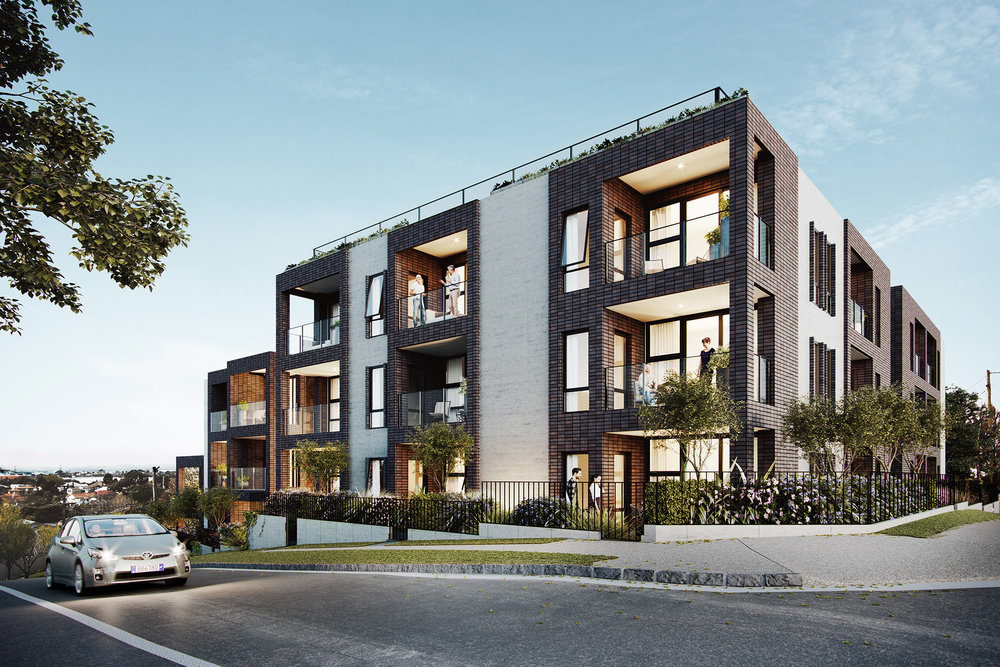 Designed by Peddle Thorp, Element features a solid and honest material palette of brick and pre-cast concrete that is low maintenance and fits the local aesthetic of brick and tile houses.