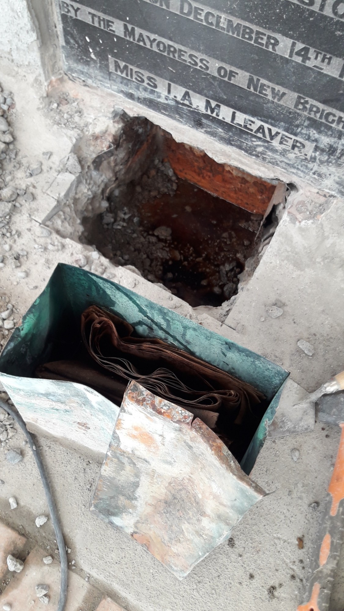 The Canterbury Team currently undertaking additional repair work on the New Brighton Clock Tower structure have come across a Time Capsule laid under the foundation stone. This exciting discovery likely dates back to 1934, the time the structure was erected.