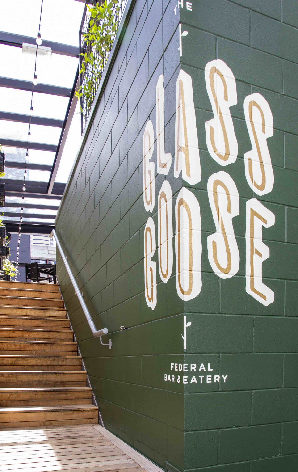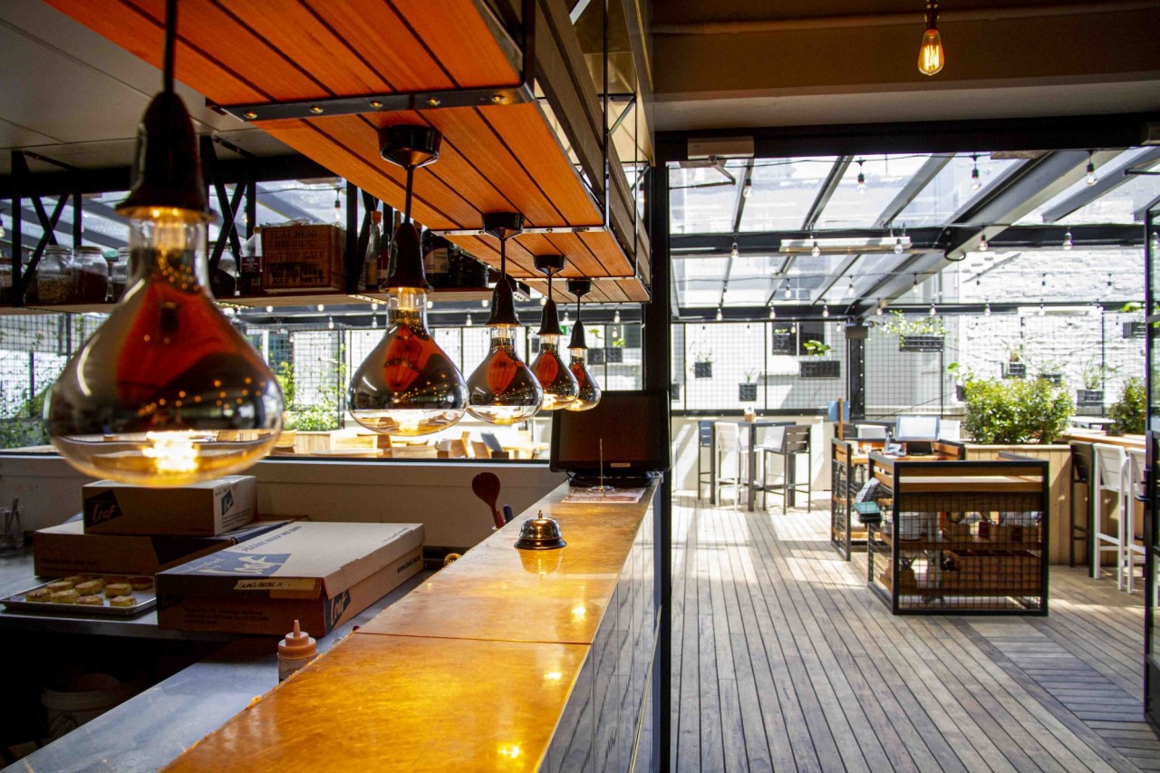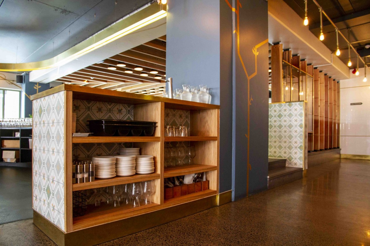 The Glass Goose is designed to mimic the look and feel of a beautiful glass-house. The large dining area and 360-degree bar at the inside, and a spacious rooftop terrace in front features a sophisticated mix of carefully selected materials: glass barriers, a combination of oak timber and polished concrete floors, black steel elements, golden pipes, and a living wall. The interior is brightened up with the use of Portuguese tiles and terra cotta amphora-style plant pots, giving it a hint of the Mediterranean.