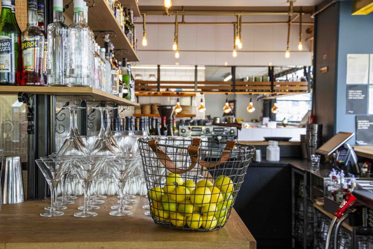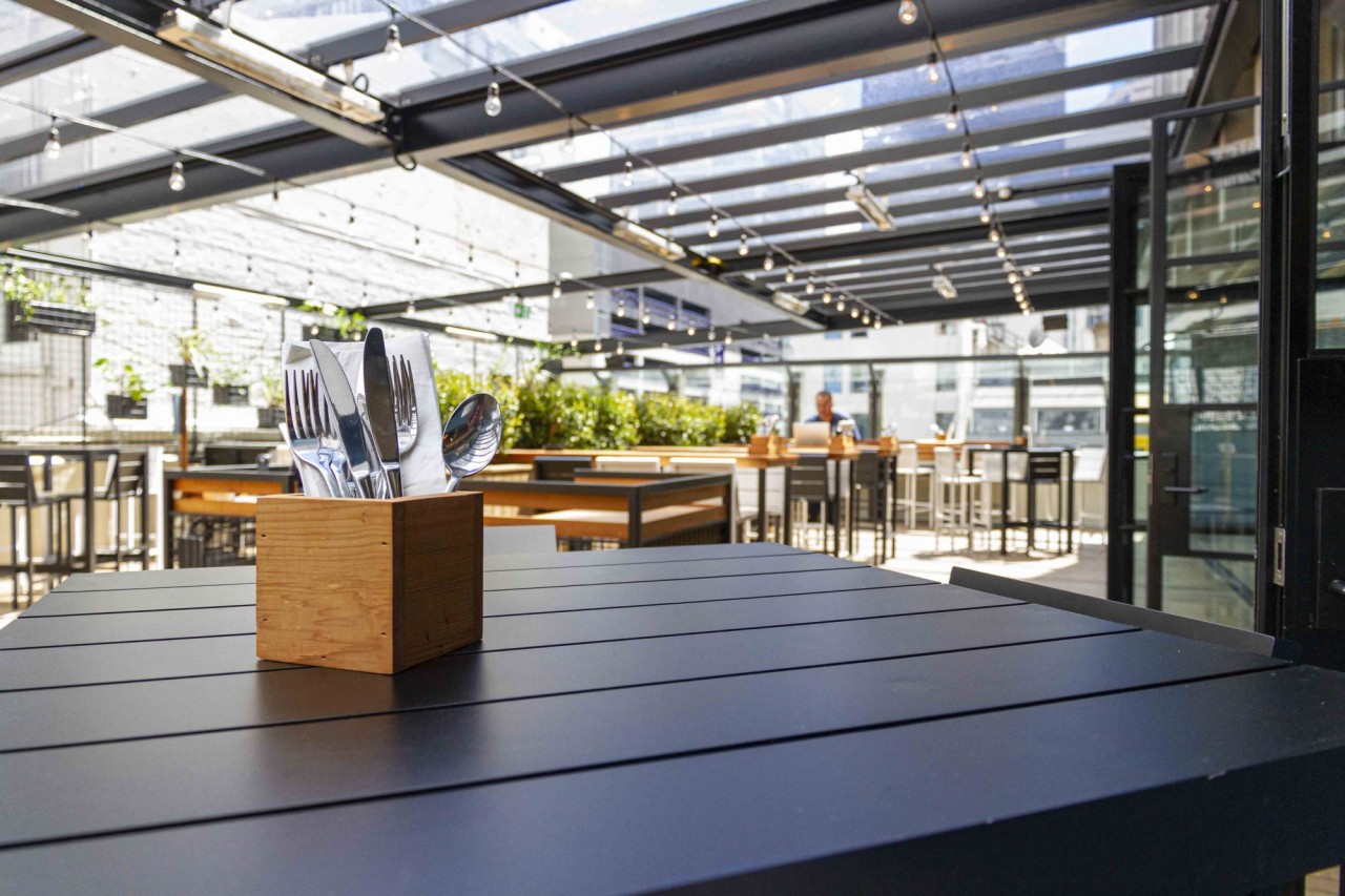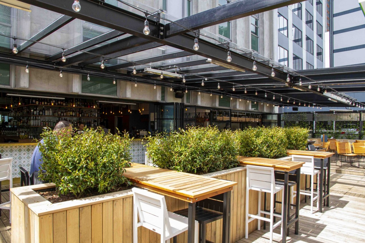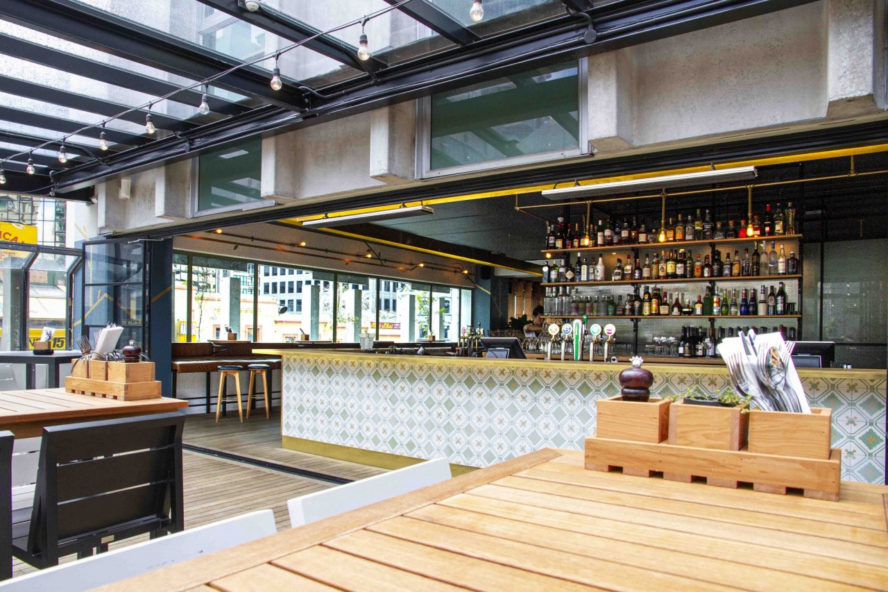The Glass Goose is designed to mimic the look and feel of a beautiful glass-house. The large dining area and 360-degree bar at the inside, and a spacious rooftop terrace in front features a sophisticated mix of carefully selected materials: glass barriers, a combination of oak timber and polished concrete floors, black steel elements, golden pipes, and a living wall. The interior is brightened up with the use of Portuguese tiles and terra cotta amphora-style plant pots, giving it a hint of the Mediterranean.