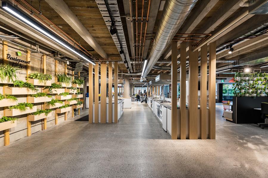 Boasting ten state of the art cooking stations and appliances, plus a ‘living wall’ of herbs, the kitchen space was designed as a functional and innovative working environment. Both light and bright, the space features subway tiles, wooden feature panels, exposed industrial-style ceilings, and polished concrete flooring. The space is modern, edgy and a perfect fit for the ambitious foodies.